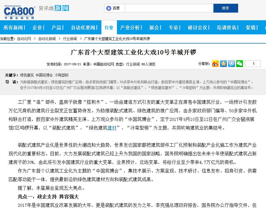 中國鋼結構資訊網發布有關2017中國筑博會·廣州開幕式的報道 (2017-10-30)