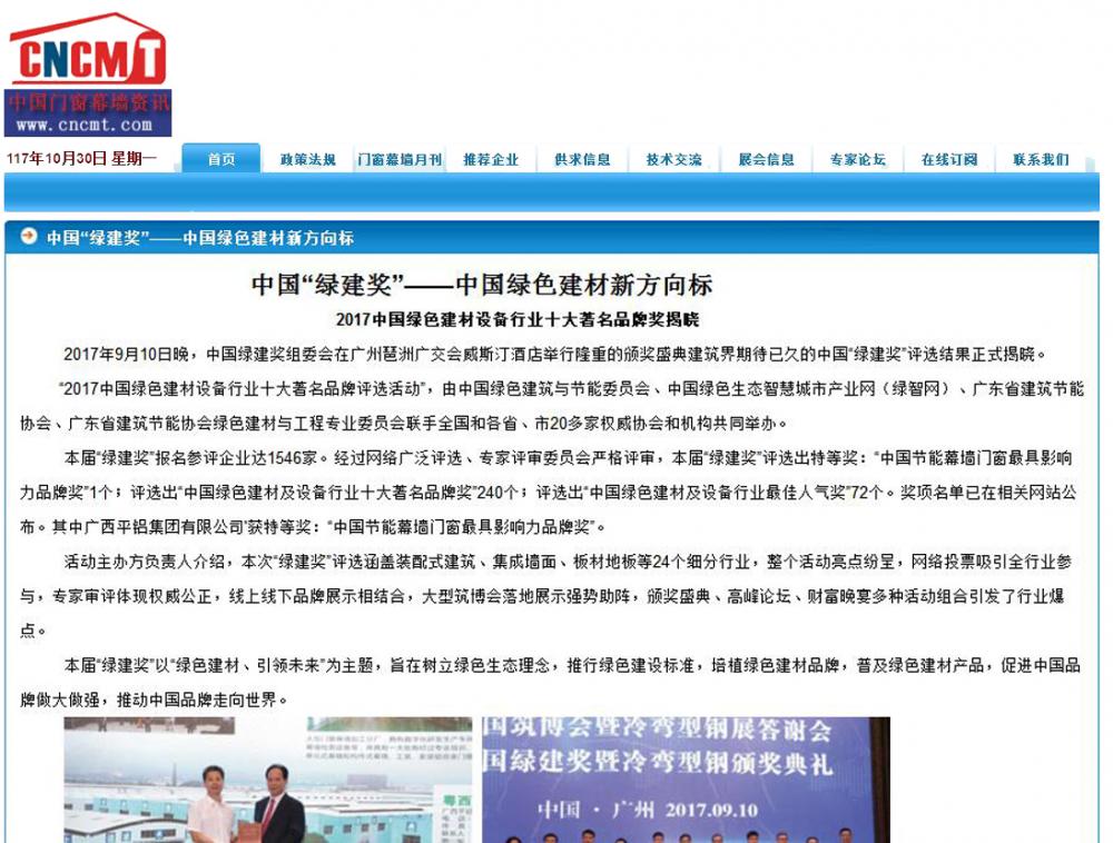 中華整木網(wǎng)發(fā)布有關(guān)2017中國綠色建材設(shè)備行業(yè)十大著名品牌獎的報道 (2017-10-30)