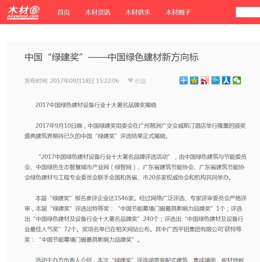 中國門窗幕墻資訊網發布有關2017中國綠色建材設備行業十大著名品牌獎的報道 (2017-10-30)