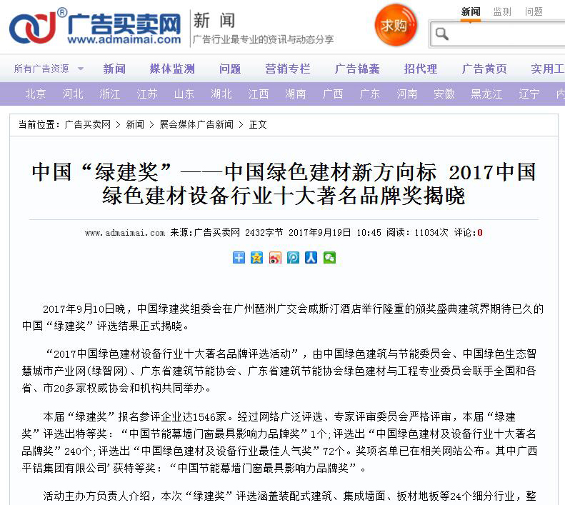 中國門窗幕墻資訊網(wǎng)發(fā)布有關(guān)2017中國綠色建材設(shè)備行業(yè)十大著名品牌獎的報(bào)道 (2017-10-30)