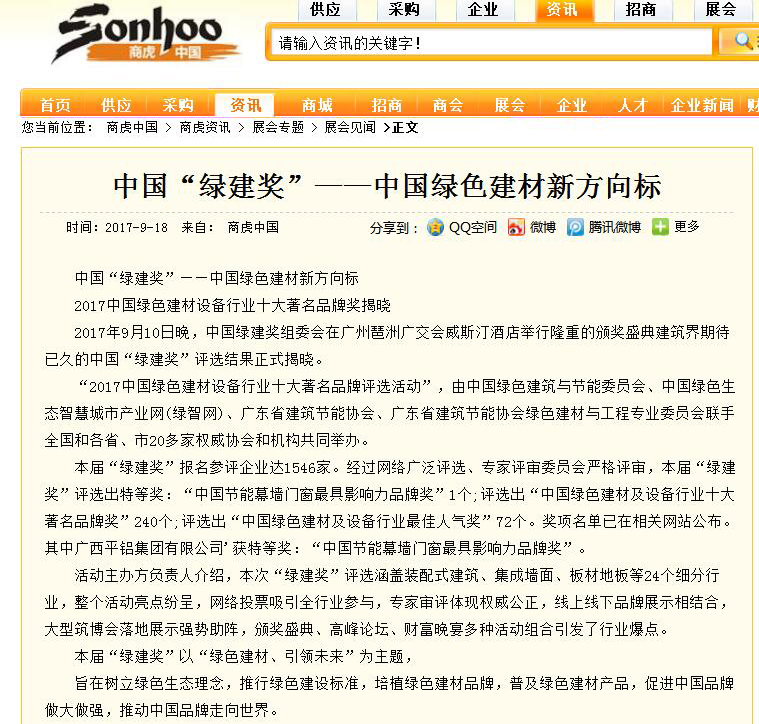 綠建之窗網發布有關2017中國綠色建材設備行業十大著名品牌獎的報道 (2017-10-31)